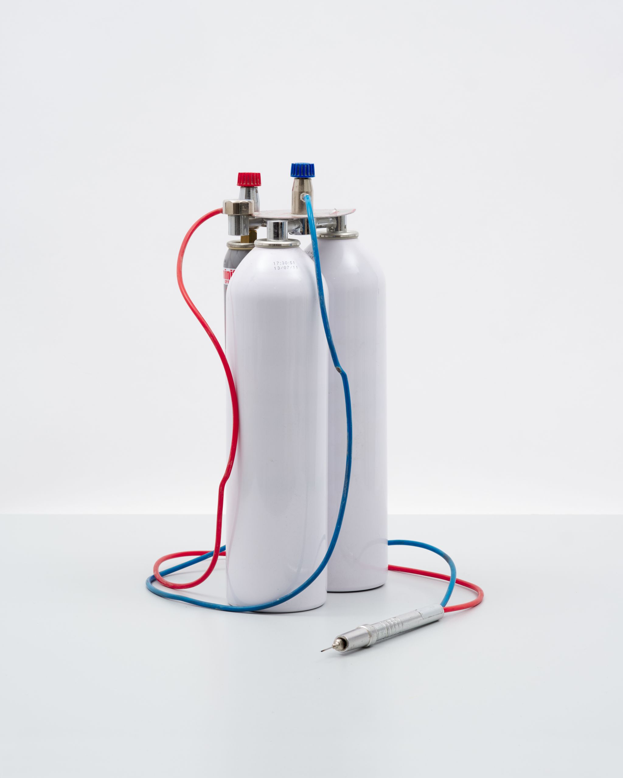 We make sure lenses and plastic nose pads are removed before starting. The next and best step is creating a flame with oxygen and gas. We’re going for a little blue flame: when it’s orange, it means that it hasn’t reached the needed temperature yet. At the tip of the blue flame (1200°c), we melt a soldering stick and add a drop of liquid to the broken parts. Both parts are connected and held together by the solder. After the frames are cooled, they will be cleaned, polished, and ready to be used again.